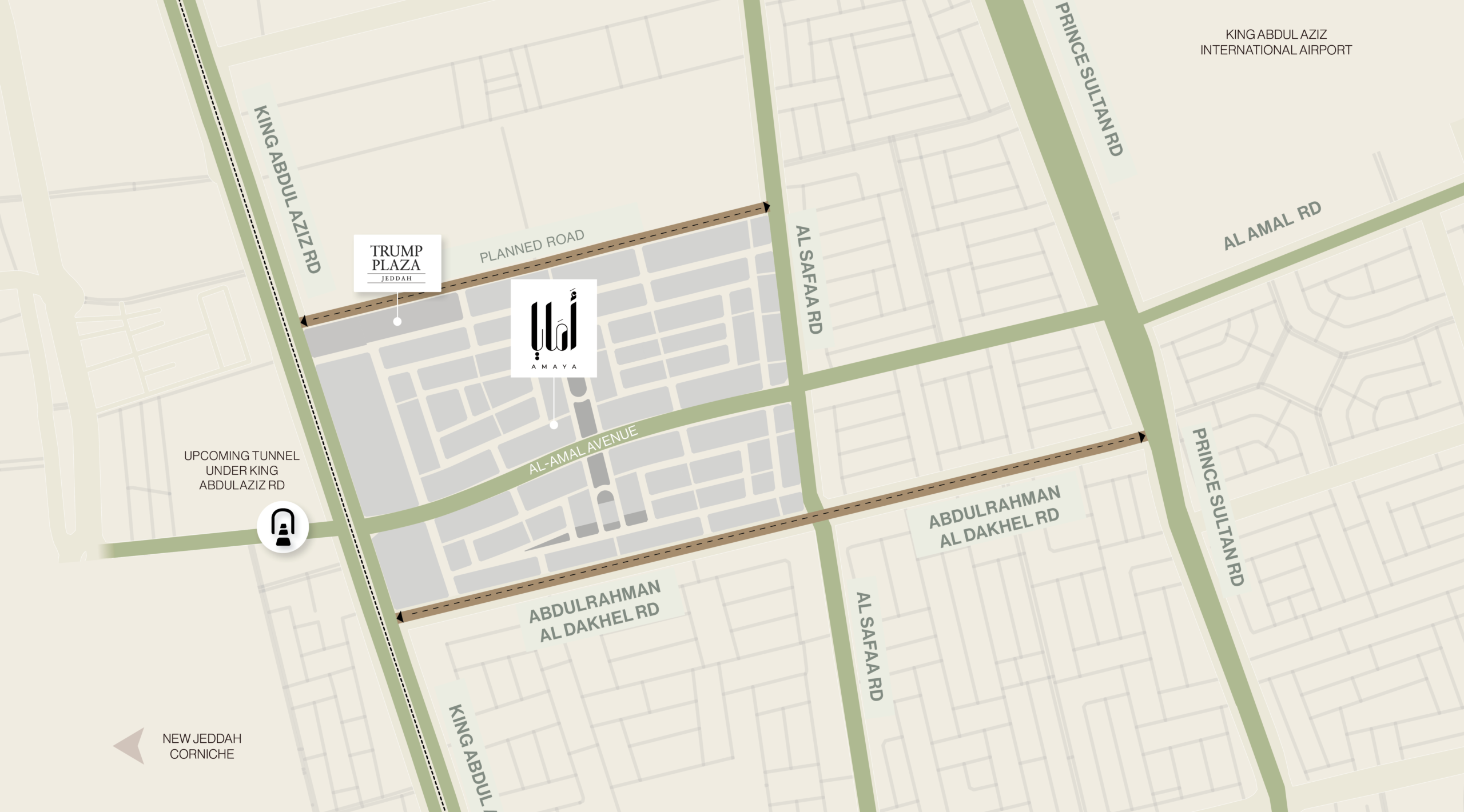 Positioned along King Abdulaziz Road and anchored by the landmark Al-Amal Avenue, Amaya offers exceptional accessibility across the city, with direct links to Jeddah Corniche, the Formula 1 Circuit, international schools, healthcare facilities, and King Abdulaziz International Airport. A planned tunnel beneath King Abdulaziz Road further enhances traffic flow and connectivity to the Al Shatea district.