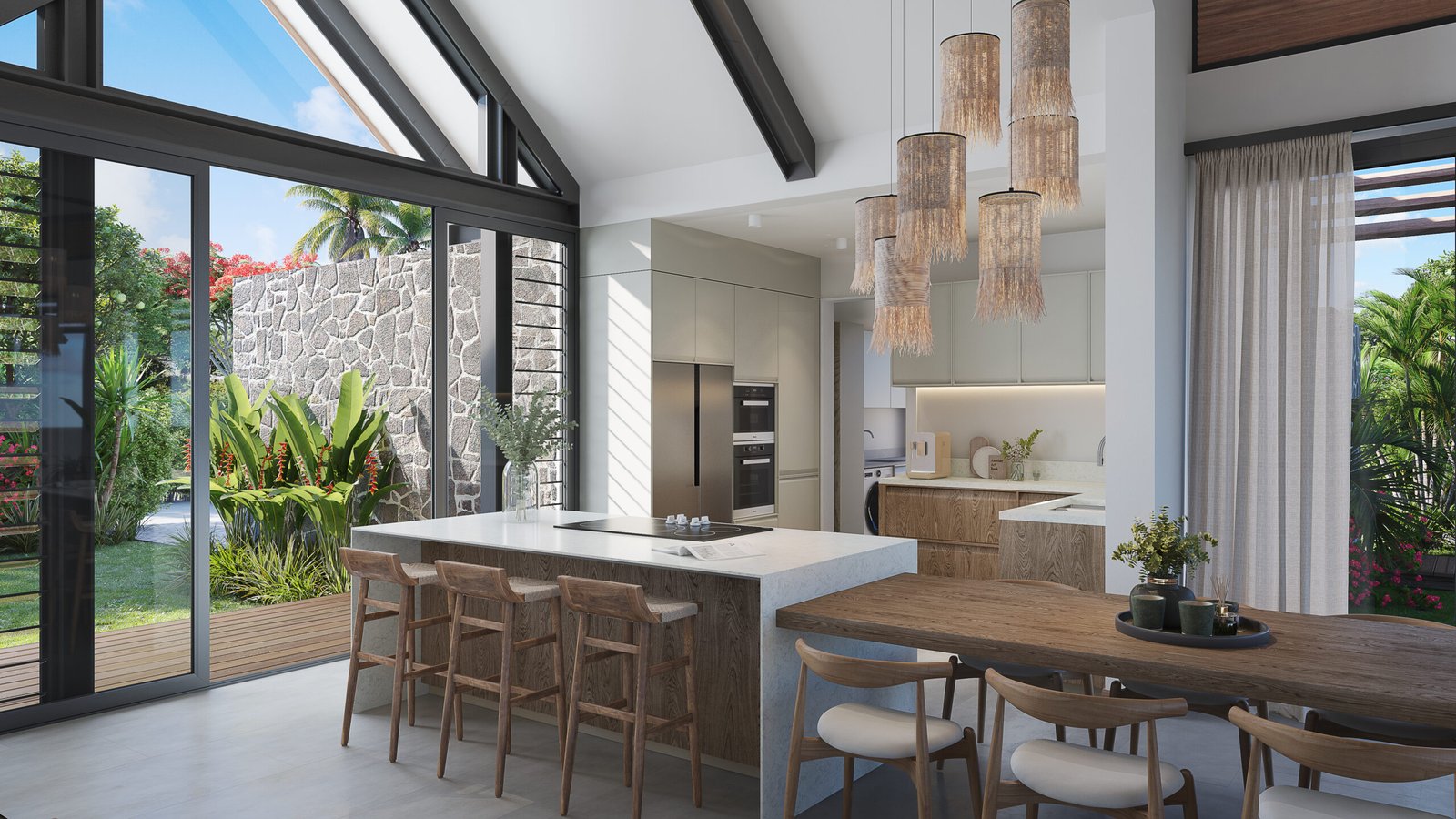 Each villa blends warm natural stone, timber finishes, and curved pitched roofs to create a timeless, elegant look. The open-plan design allows for seamless indoor–outdoor living, with wide verandas, lush tropical landscaping, and a private pool surrounded by greenery.